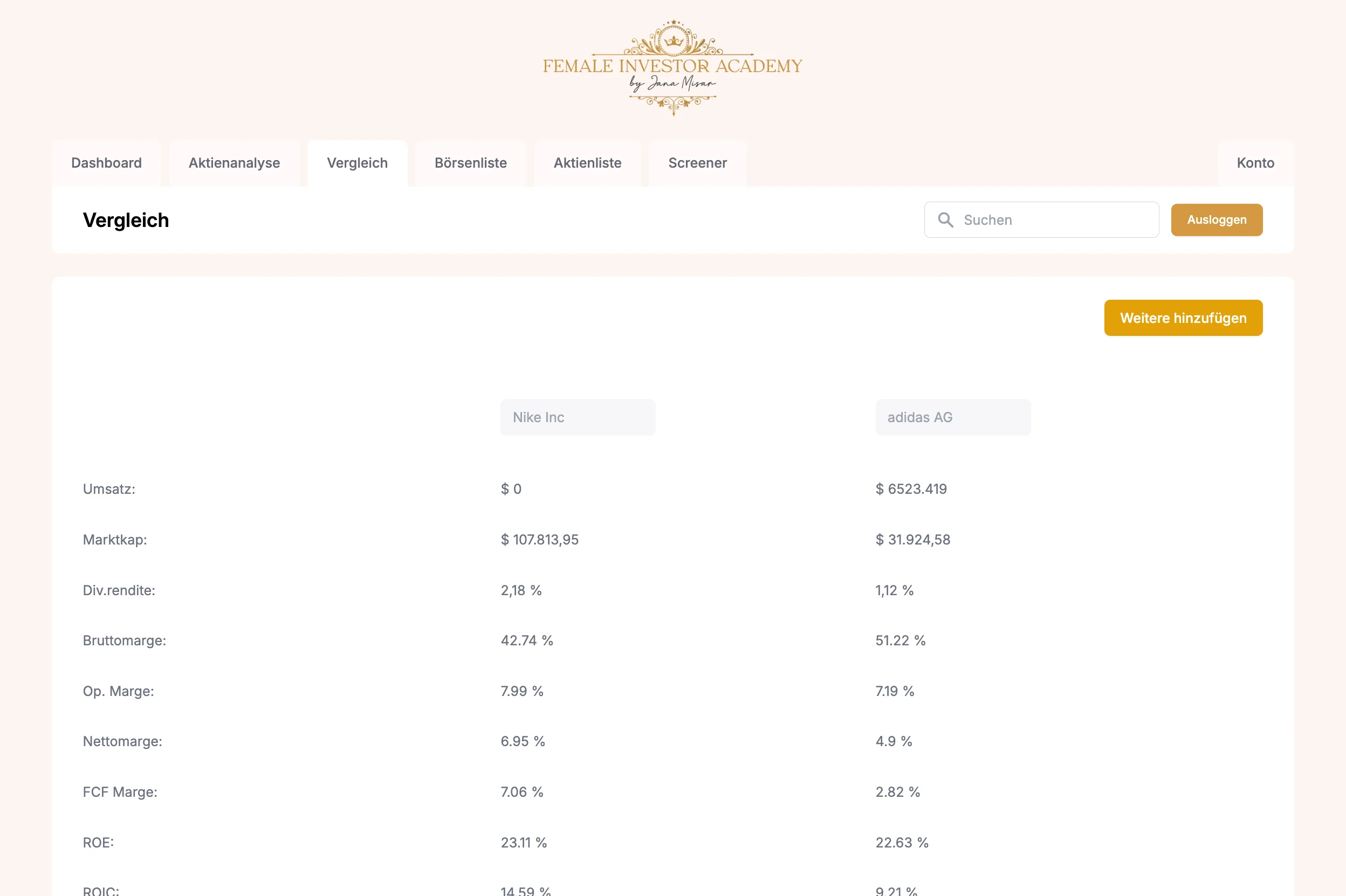 Die Female Investor Academy hatte eine wachsende Community von Frauen, die sich für Aktieninvestments interessierten. Was fehlte, war ein professionelles Tool zur Aktienanalyse. Excel-Tabellen stießen an ihre Grenzen, externe Tools waren entweder zu komplex oder nicht auf die Bedürfnisse der Community zugeschnitten.