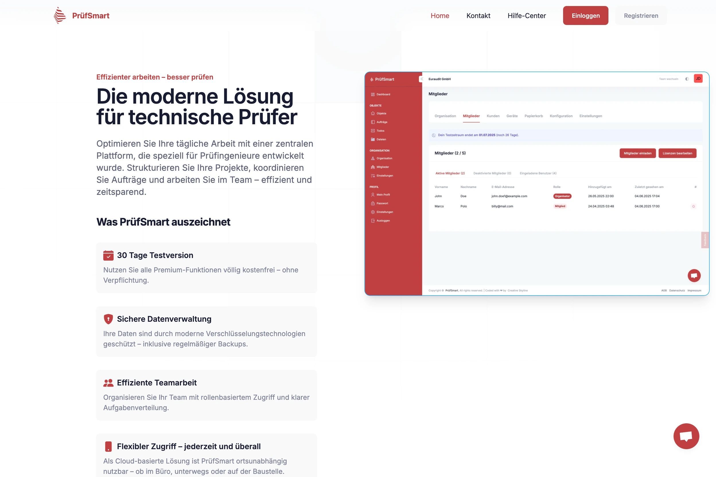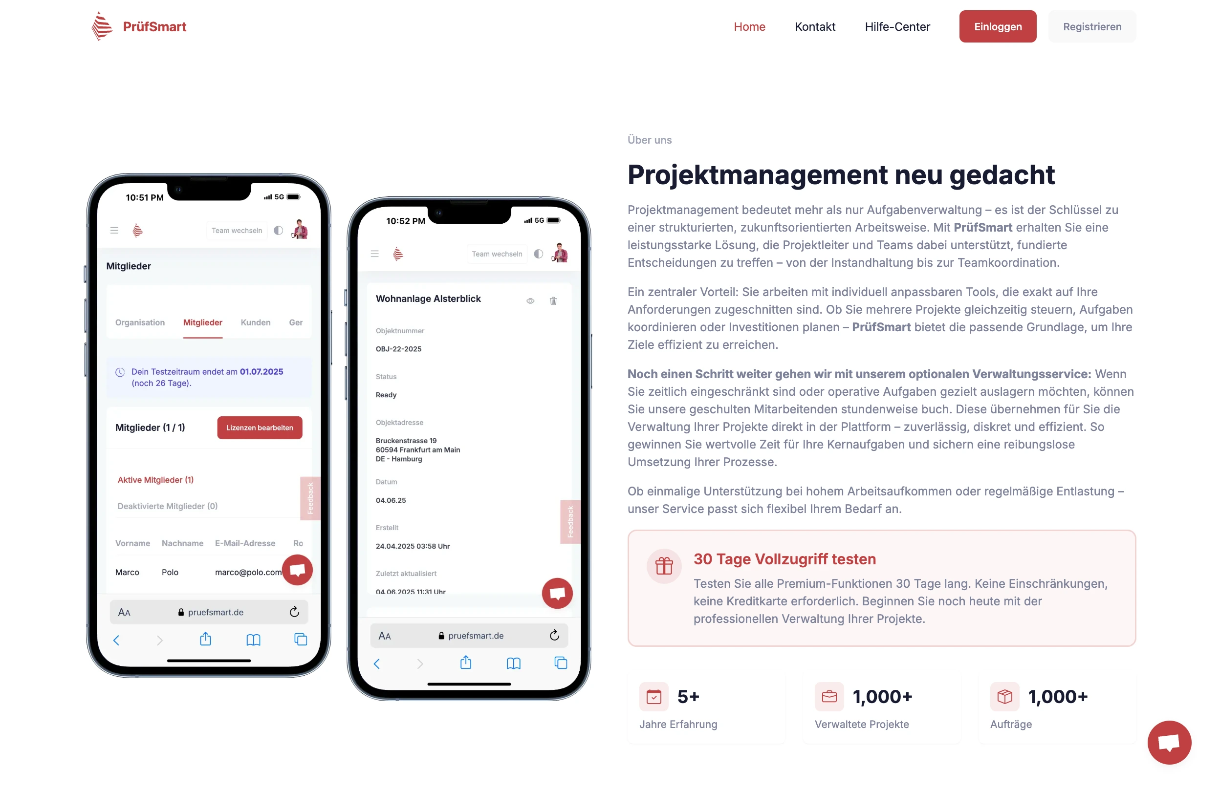 Der erste Schritt war eine Software. Tobias brauchte eine zentrale Plattform, um seine Aufträge, Berichte und Objekte zu verwalten. Keine Standardlösung von der Stange, sondern etwas, das zu seinem Arbeitsalltag passt. Creative Skyline entwickelte PrüfSmart - eine individuelle Web-App, zugeschnitten auf die Anforderungen technischer Prüfer.