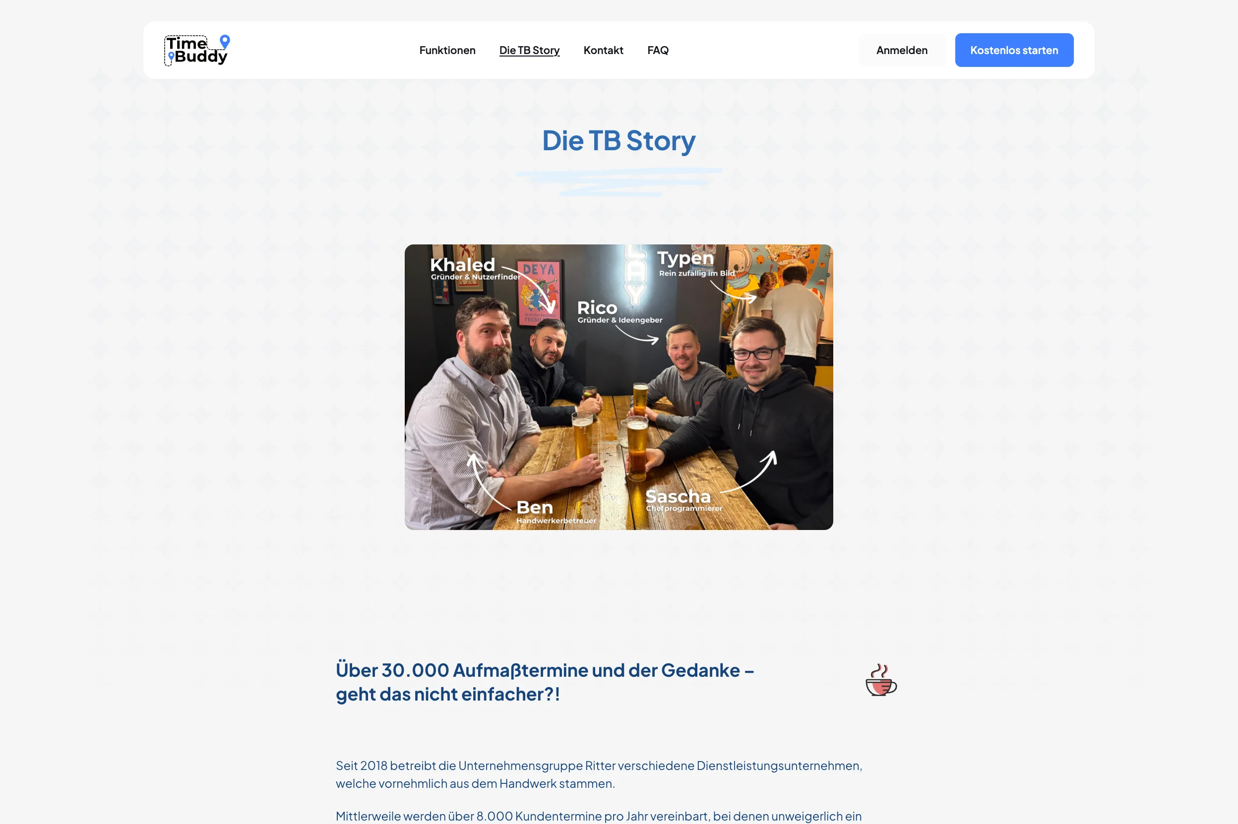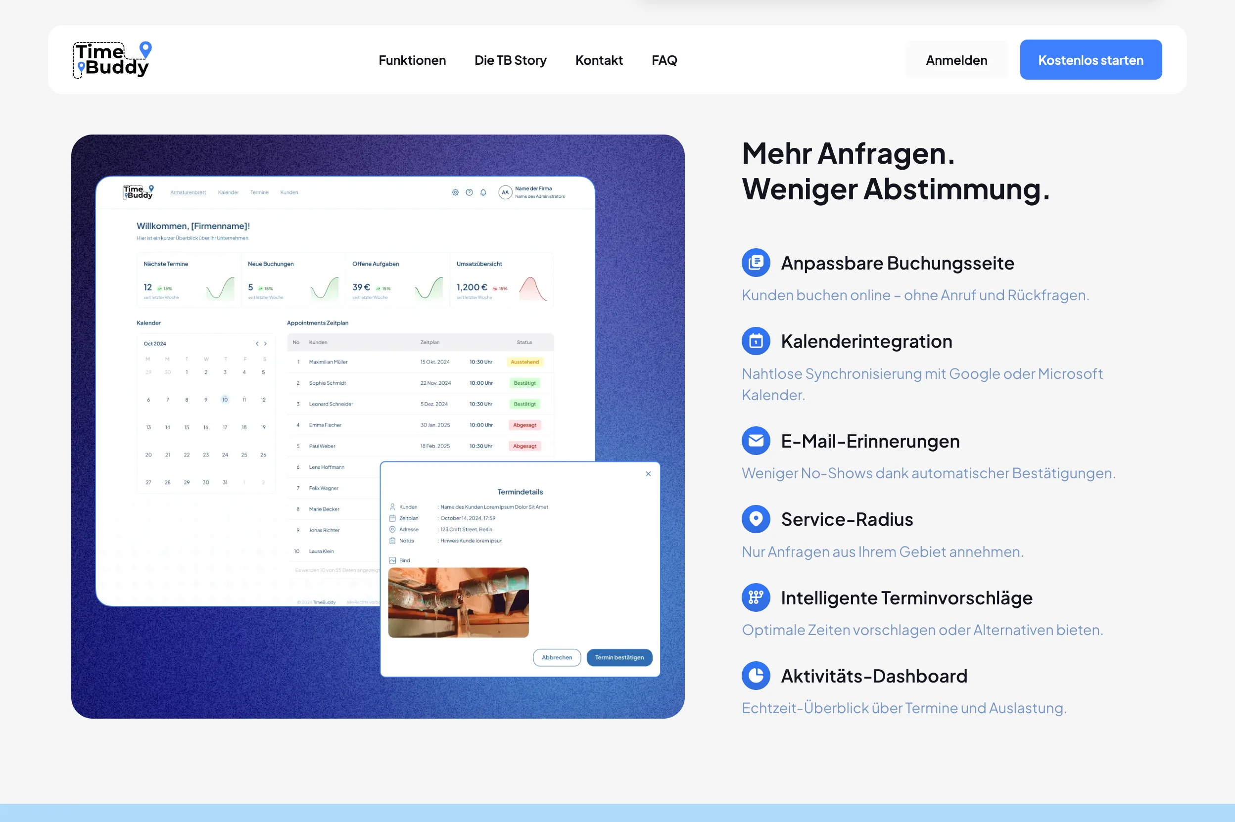 TimeBuddy entstand aus einer einfachen Beobachtung: Handwerker verbringen zu viel Zeit am Telefon, um Termine zu koordinieren. Die Lösung sollte eine Online-Terminbuchung sein, die Kunden direkt nutzen können. Keine aufwändigen Telefonate mehr, keine Doppelbuchungen, keine verpassten Anfragen außerhalb der Geschäftszeiten.
